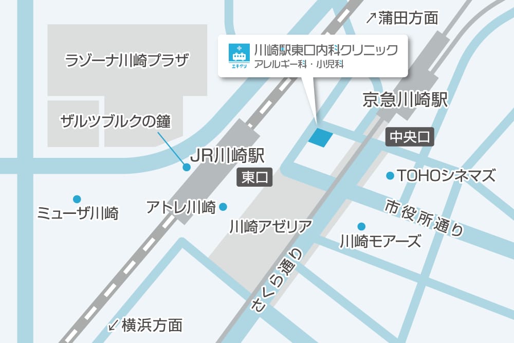 川崎駅東口内科川崎駅から徒歩2分09:30~13:00, 15:00~19:00(平日)/09:30~13:00, 14:30~17:15(土日祝)川崎駅(JR徒歩2分・京急徒歩1分)そばの総合クリニック。平日は19時まで受付、土日祝も診療(最終受付17:15)で通いやすく、オンライン診療や自費のED治療に対応。駅近と休日診療が選ばれる理由です。料金(税込) -詳細を見る公式サイトを見る